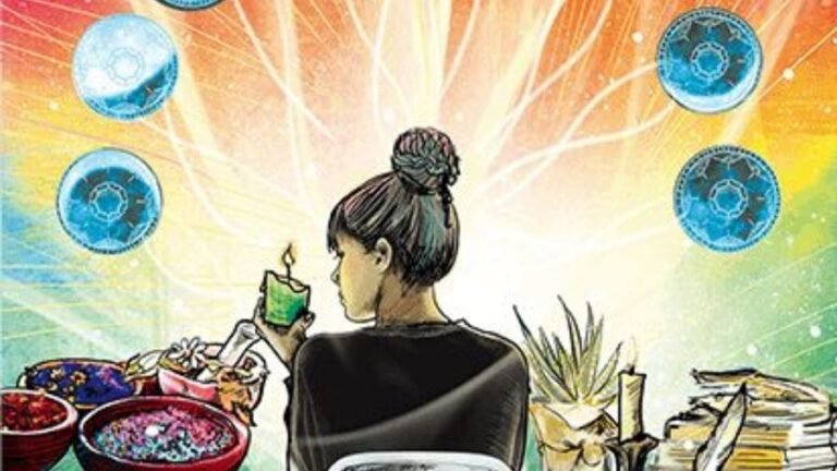- 懸掛的九枚曼陀羅錢幣:背景中懸掛著九枚大小不一、色彩斑斕的曼陀羅錢幣,與乾燥的藥草捆綁在一起。這代表她的財富是多樣化的,且帶著療癒與滋養的特質。這些成果已經「掛在那裡」,隨時供她享用。