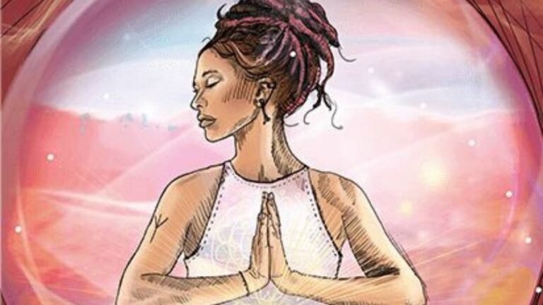 - 背景的生命巨輪: 她身後有一個巨大的曼陀羅圓盤,像是齒輪也像太陽。這象徵大環境的運轉與時間的齒輪,提醒我們個人節奏需要與宇宙的流動對齊。